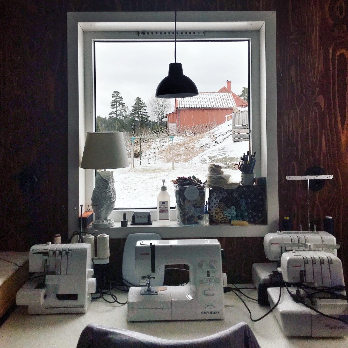 I min ateljé i Segersäng har jag plats med butik, ateljé och lager – allt under samma tak. Här gör jag alla plagg från grunden; allt från att konstruera och rita mönster till att klippa ut plaggen, trycka motiven och till sist att sy ihop dem.