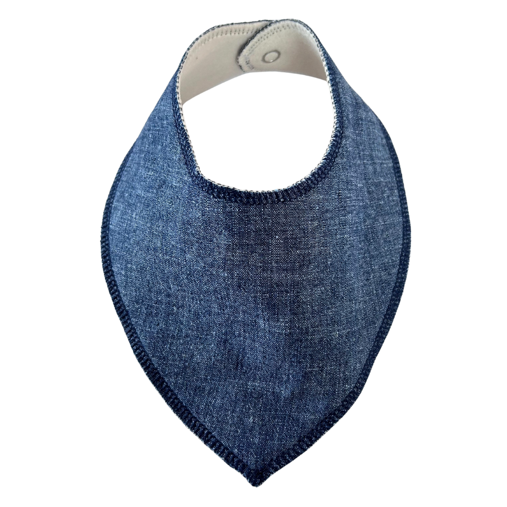 En stilren dreggelscarf som håller kläderna torra. Dregglisen är sydd av By Lelou i ett denimblått tyg tillverkat av hampa och ekologisk bomull, ett mjukt tyg med fin struktur och naturlig känsla.