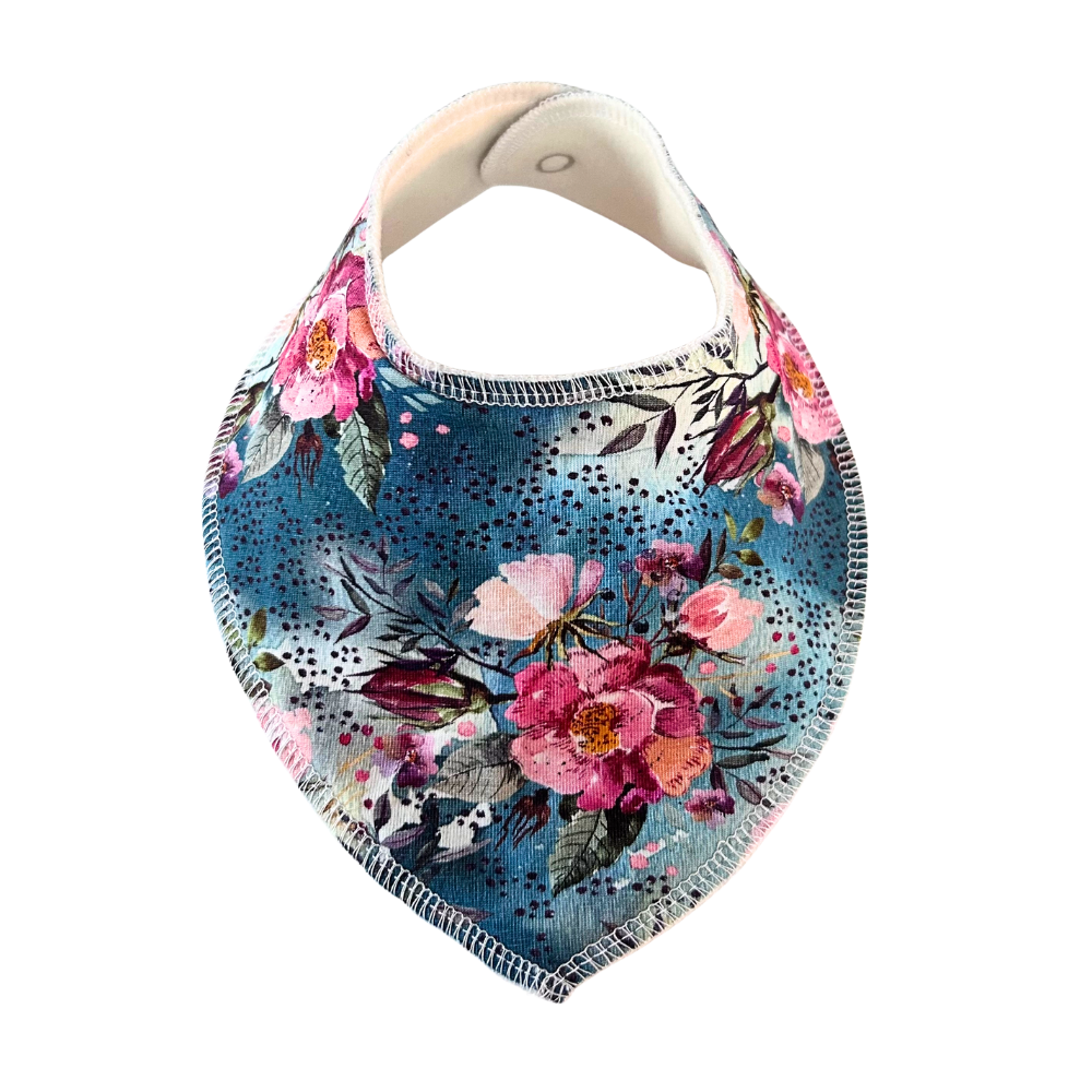 En praktisk och dekorativ dreggelscarf som håller kläderna torra. Sydd av By Lelou i en mjuk, ekologisk bomullstrikå och fodrad med mjuk, rejäl ekologisk bomullsfleece.