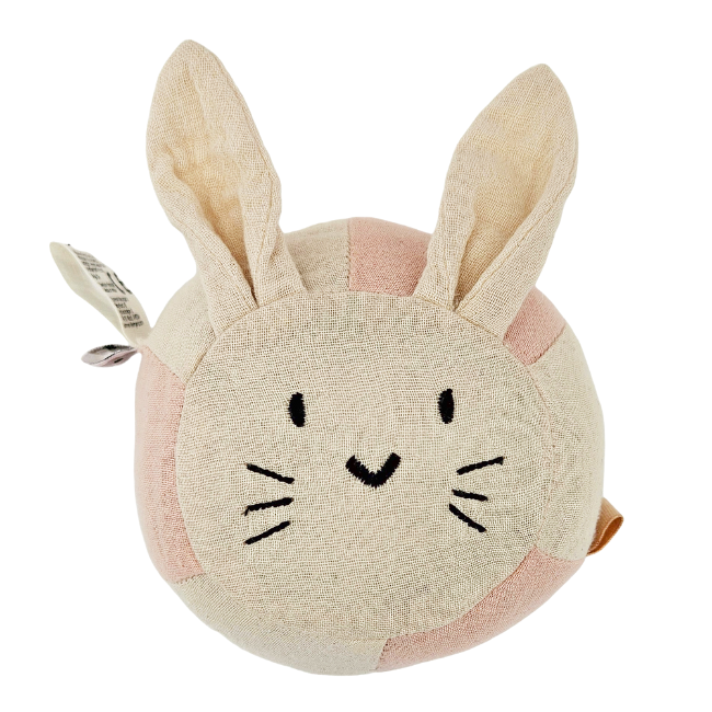 Bollskallran i färgen Sandshell är formad som en mjuk kanin med långa öron och små färgglada lappar som bjuder in till nyfiken lek. Inuti gömmer sig en pinglande skallra som ger ifrån sig ett mjukt ljud vid rörelse, perfekt för att fånga barnets uppmärksamhet.