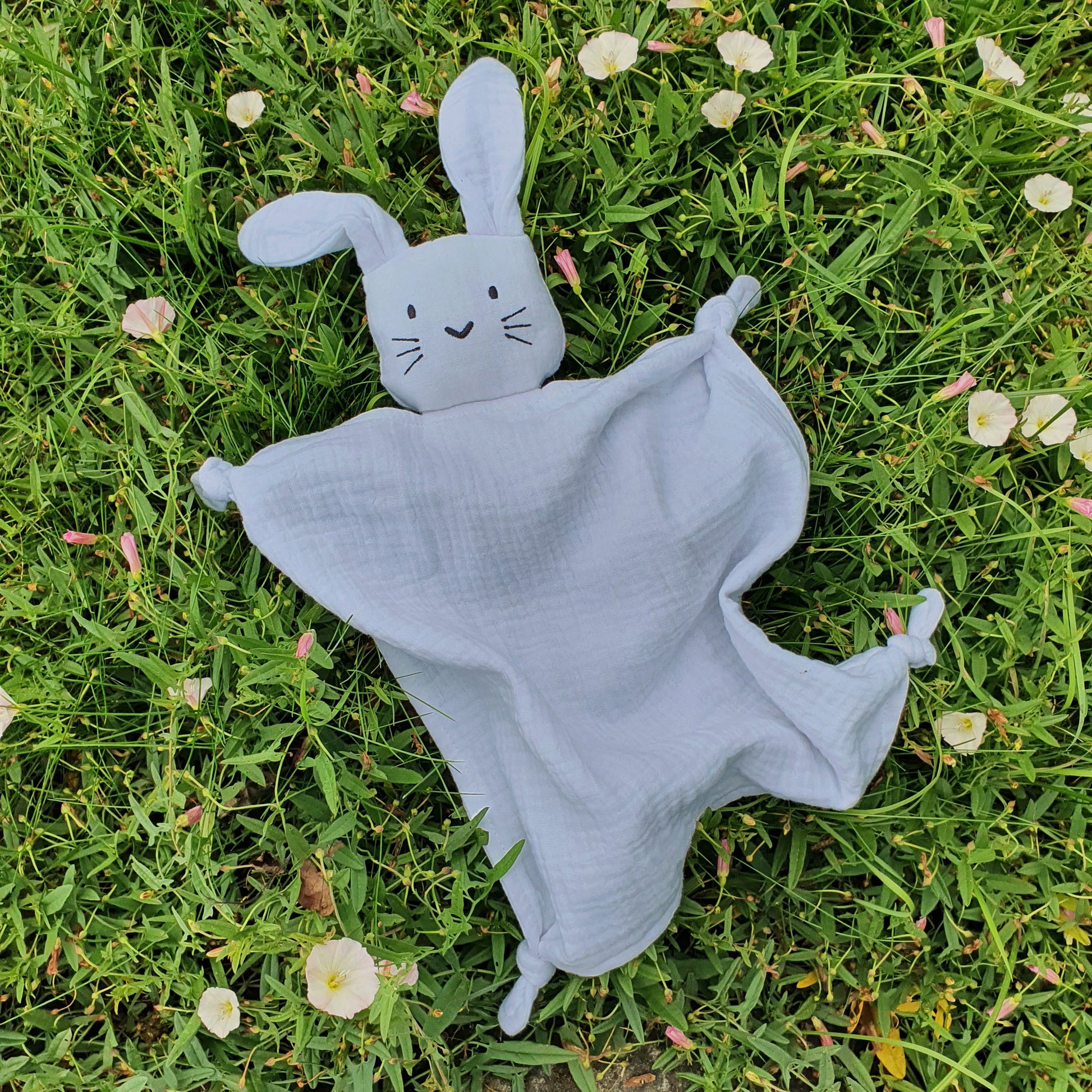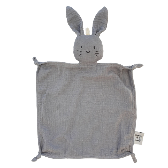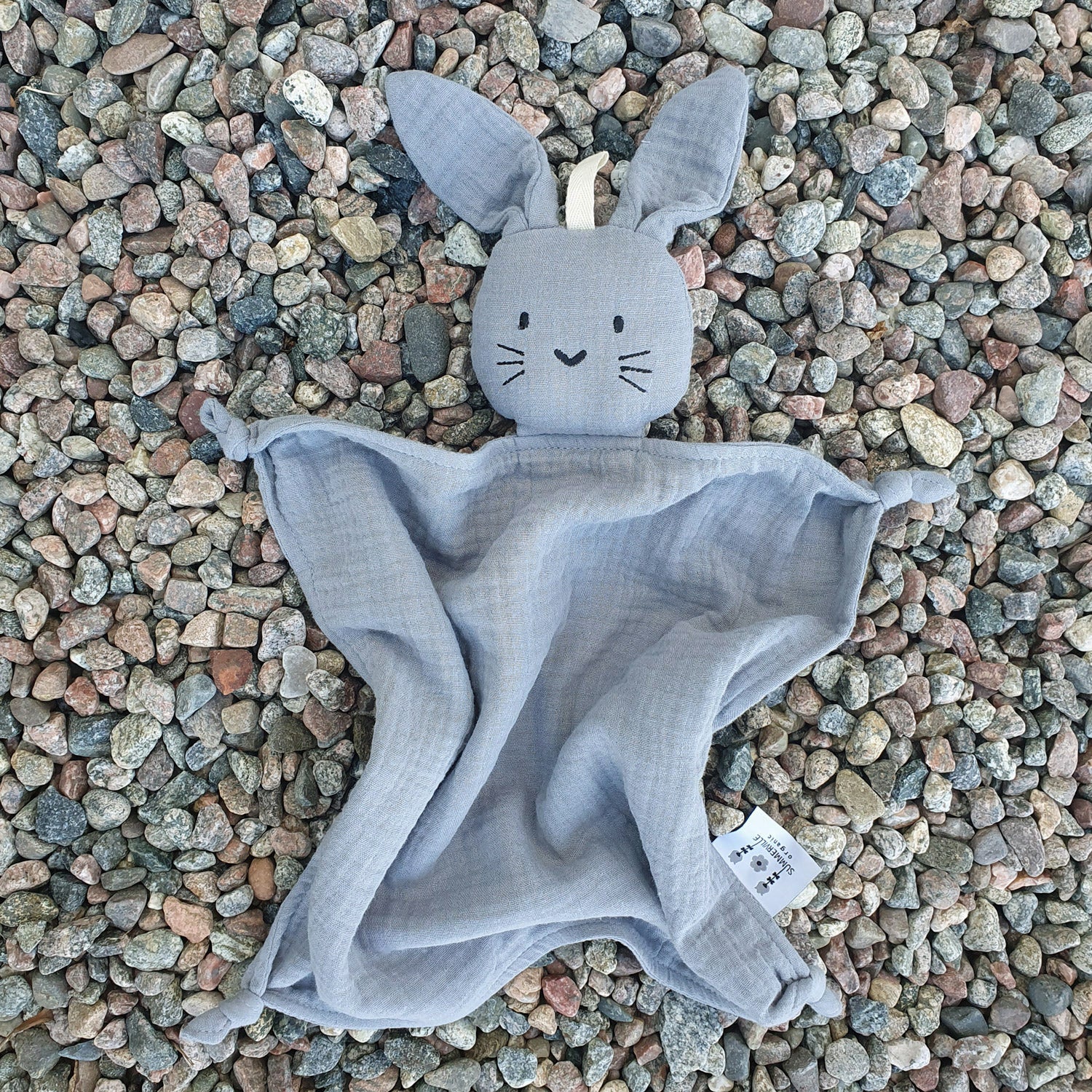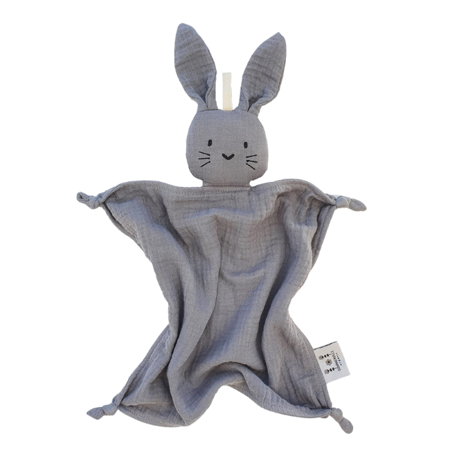 Snuttekaninen i färgen Grå är både en gosig snuttefilt och en söt kanindocka att leka med. De långa öronen och knutarna i hörnen är perfekta att fingra på för små händer som söker tröst och trygghet.