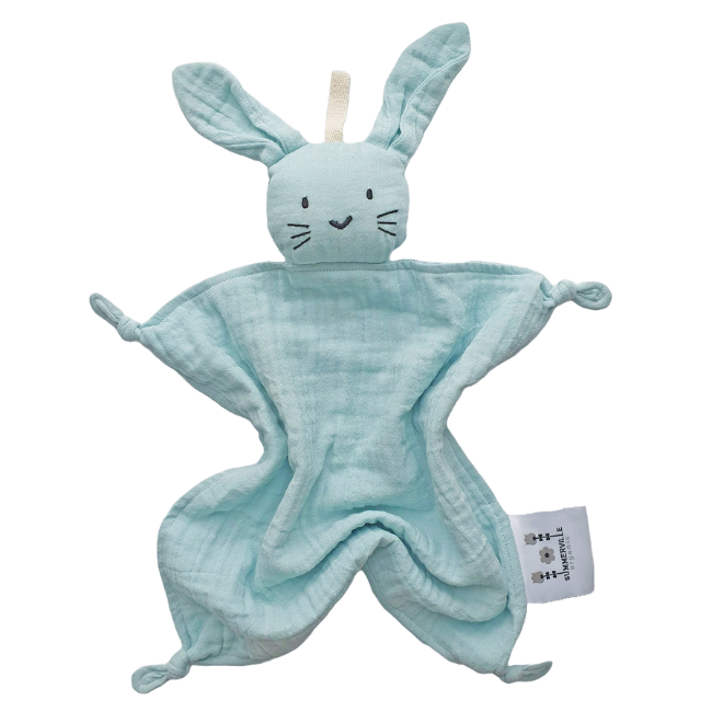 Snuttekaninen i färgen Isblå är både en gosig snuttefilt och en söt kanindocka att leka med. De långa öronen och knutarna i hörnen är perfekta att fingra på för små händer som söker tröst och trygghet.